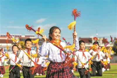 11月3日,江蘇省海安市城東鎮(zhèn)西場(chǎng)小學(xué)學(xué)生在操場(chǎng)上練習(xí)“健康連廂”。該校將非物質(zhì)文化遺產(chǎn)“打連廂”引進(jìn)校園,聘請(qǐng)非遺傳承人編排“健康連廂”,將時(shí)尚的音樂(lè)、舞蹈元素融入傳統(tǒng)“打連廂”之中,在全校師生中推廣,成為校園一道獨(dú)特而亮麗的風(fēng)景線。