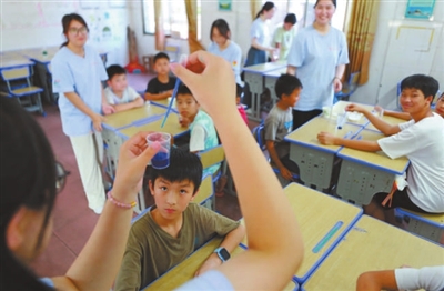 另一間教室里,鹽城師范學院支教大學生吳方燁帶著孩子們在做趣味化學實驗,看到泡沫從瓶口不斷涌出,孩子們一片驚呼。這一刻,科學不再是枯燥的公式,而是在指尖躍動的奇妙魔法。