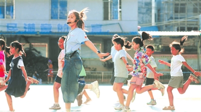 操場上,鹽城師范學院支教大學生教孩子們跳舞。