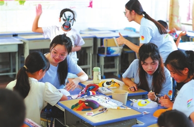 “這些臉譜背后藏著哪些英雄故事呀?”暑期,廣西桂林市興安縣高尚鎮(zhèn)中心小學的一間教室里,孩子們握著畫筆,專注地描畫關羽的丹鳳眼、包公的月牙,筆尖跳躍著朱砂紅,手中的臉譜熠熠生輝,仿佛歷史人物正對新時代的小傳人微笑。一旁,江蘇省鹽城師范學院支教大學生趙文秀臉上也露出了欣慰的笑容。
