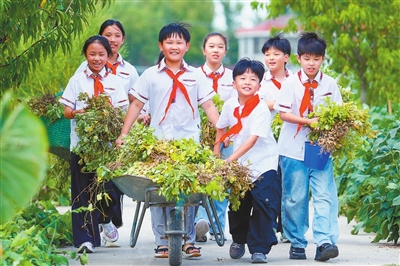 9月21日,江蘇省海安市南屏小學(xué)學(xué)生來到海安高新區(qū)孫莊街道嵐水農(nóng)場,開展“快樂豐收節(jié) 勞動伴成長”農(nóng)場實踐活動,在汗水中感受豐收的喜悅。圖為學(xué)生們在運(yùn)送剛收獲的花生。 顧彬斌 攝