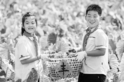 9月23日,江蘇省海安高新區(qū)實(shí)驗(yàn)小學(xué)學(xué)生在田間采收芋頭。 翟偉凱 攝