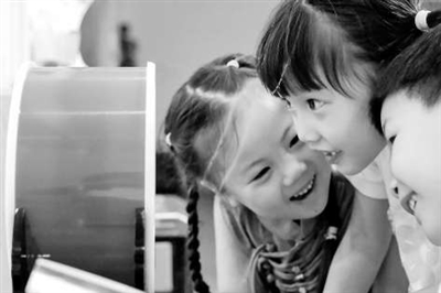 近日,浙江省長興縣水口鄉(xiāng)中心幼兒園的孩子體驗“時光隧道”科普教具。 譚云俸 攝