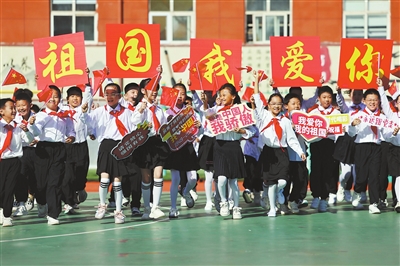 近日,山東省臨沂市沂南縣第三實(shí)驗(yàn)小學(xué)學(xué)生為祖國獻(xiàn)上祝福。
