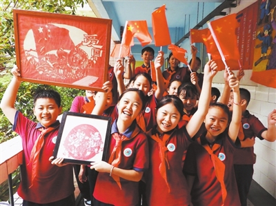 近日,四川省達(dá)州市開江縣西城小學(xué)學(xué)生展示制作的“祝福祖國”創(chuàng)意剪紙作品。