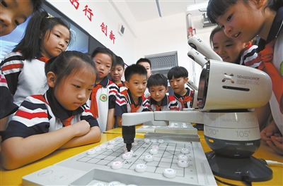 近日,河北省邯鄲市邯山區(qū)農(nóng)林路小學(xué)學(xué)生與AI棋類機(jī)器人對弈。秋季新學(xué)期,該校引入兩臺AI棋類機(jī)器人擔(dān)任“AI陪練員”。學(xué)生們可與AI棋類機(jī)器人對弈多種棋類,直觀感受人工智能的魅力。 郝群英 攝