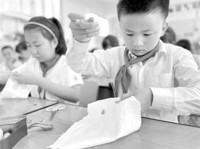 學生參加學校勞動技能大賽之釘紐扣。 煙臺市芝罘區(qū)魯峰小學供圖