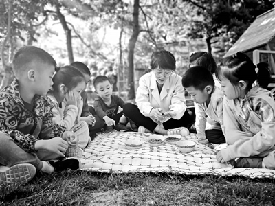 保育員王淑紅原來在服裝廠工作,懂裁剪技術。一次,教師李敏參加青年教師基本功大賽,需要沙包教具。為讓布料、大小規(guī)格更加合適,王淑紅參與到了教學現(xiàn)場中來。了解教師的要求后,她連夜縫制了20個沙包,保證了第二天的教學活動順利完成。就這樣,保育員把傳統(tǒng)手藝變成教育手段,和專任教師一同站在了教學現(xiàn)場。