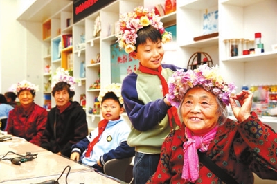10月27日,江蘇省連云港市連云區(qū),學生給老人戴上簪花發(fā)箍。當日,連云區(qū)墟溝街道桃園社區(qū)聯(lián)合東港小學開展民俗文化體驗活動,讓小學生和老人共同迎接重陽節(jié)。 朱華南 攝