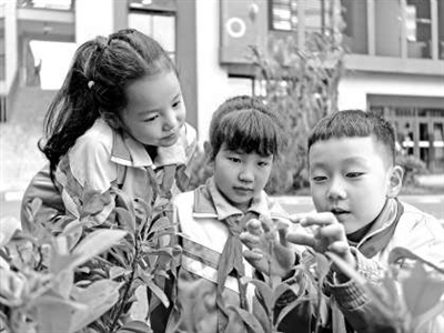 ①?gòu)V元市實(shí)驗(yàn)小學(xué)的學(xué)生觀察校內(nèi)植物。董彬 攝