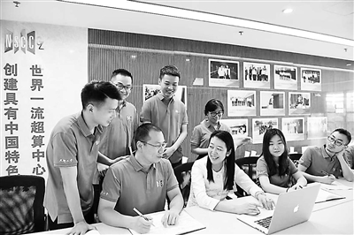 國(guó)家超級(jí)計(jì)算廣州中心主任、中山大學(xué)計(jì)算機(jī)學(xué)院教授盧宇彤(前排右三)與同事交流。 學(xué)校供圖