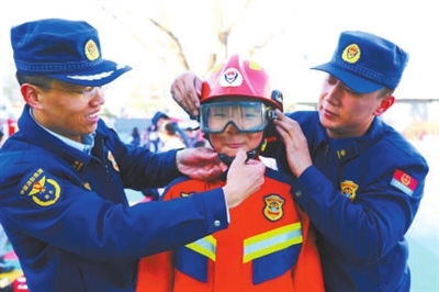 近日,該校學生在體驗消防裝備。 岑屹 攝