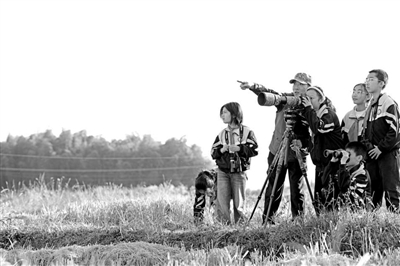 近日,茅坦小學學生在野生鳥類保護志愿者的帶領下用相機記錄鳥類。