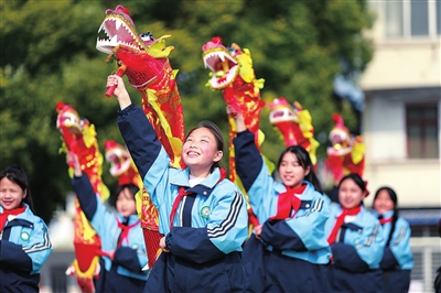 湖北省襄陽市樊城區(qū)竹條中心小學的學生們在課后服務(wù)時間練習舞龍。通訊員 聶志鵬 攝