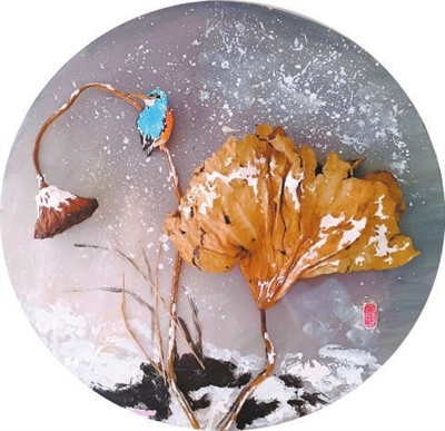 國(guó)畫(huà)裝置手工作品(主要材料:枯荷葉、泡沫板、宣紙)