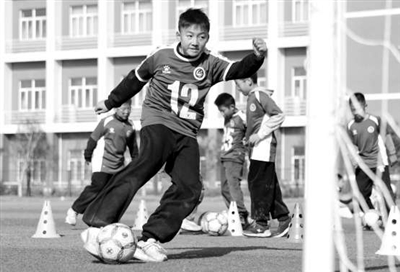 江蘇省海安市李堡鎮(zhèn)中心小學(xué)學(xué)生在體育課上練習(xí)踢足球。周強(qiáng) 攝