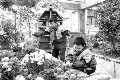 在湖北省襄陽(yáng)市松鶴路小學(xué)教學(xué)樓頂?shù)摹翱罩谢▓@”里,學(xué)生們?cè)诮處熤笇?dǎo)下養(yǎng)護(hù)盛放的菊花。 李旭暉 攝