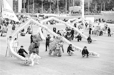 泉州輕工職業(yè)學(xué)院第九屆運(yùn)動習(xí)慣比試大會彩排現(xiàn)場,學(xué)生正在進(jìn)行非遺舞龍展示。 謝貴明 攝