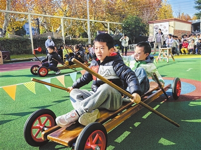 日前,浙江省杭州市蕭山區(qū)城廂幼兒園舉辦了第17屆運(yùn)動節(jié)。教師和孩子們將傳統(tǒng)運(yùn)動節(jié)變成了“項(xiàng)目化學(xué)習(xí)”大課堂。在這里,孩子們不只是運(yùn)動員,更是賽場設(shè)計(jì)師、規(guī)則創(chuàng)造者、問題解決家,他們將運(yùn)動演變?yōu)橐粓鋈诤咸骄俊f(xié)作與創(chuàng)造的綜合成長體驗(yàn)。圖為大班幼兒合作進(jìn)行劃龍舟比賽。 沈建紅 攝