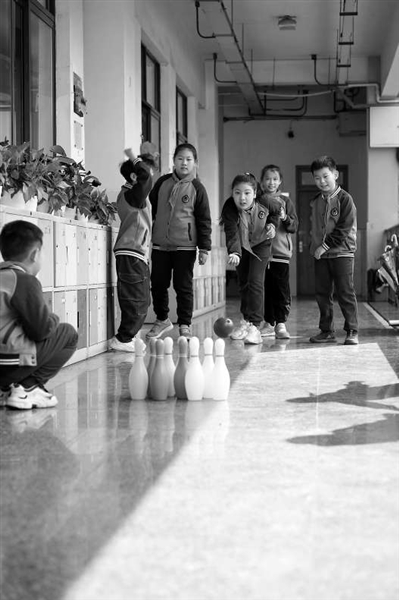 浙江省杭州市鳳凰小學(xué)學(xué)生在課間體驗(yàn)趣味保齡球項(xiàng)目。學(xué)校供圖