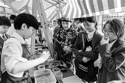 學(xué)校定期舉行美食節(jié)活動(dòng),圖為學(xué)生們?cè)诜窒碜灾泼朗场? 學(xué)校供圖