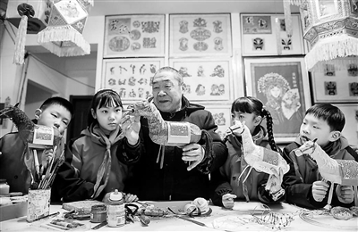 安徽省馬鞍山市含山縣市級(jí)非遺傳承人在教學(xué)生制作生肖馬燈。歐宗濤 攝