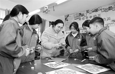 湖南省邵陽市洞口縣文昌街道洞口初級(jí)中學(xué),教師在向?qū)W生傳授剪紙技法。 滕治中 攝