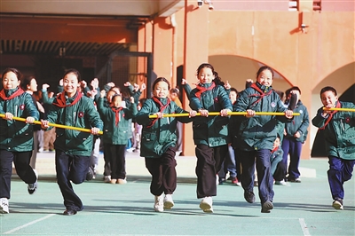 1月15日,江蘇省徐州市鼓樓小學學生在大課間參加推桿跑活動。該校根據(jù)季節(jié)特點,開展跳繩、推桿跑等適合學生冬季運動的大課間活動,引導學生走出教室進行體育鍛煉,享受運動帶來的快樂。蒯創(chuàng) 攝