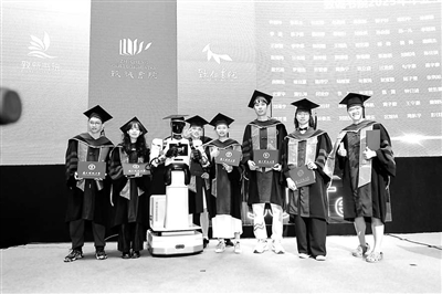 ①南方科技大學(xué)自主研發(fā)的人形機器人“南科盤古”在畢業(yè)典禮上與學(xué)生們互動。 學(xué)校供圖