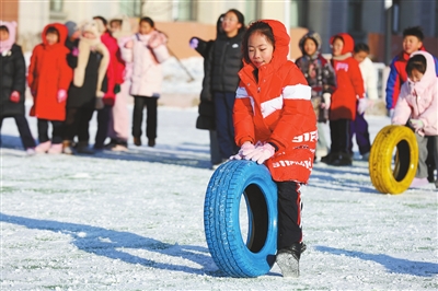 梅河口市育秀小學(xué)學(xué)生參加學(xué)校組織的雪地輪胎派對(duì)。