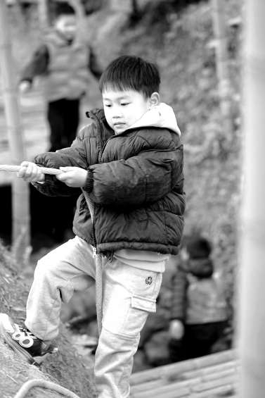 幼兒借助繩子爬山坡。 謝雪莉 供圖