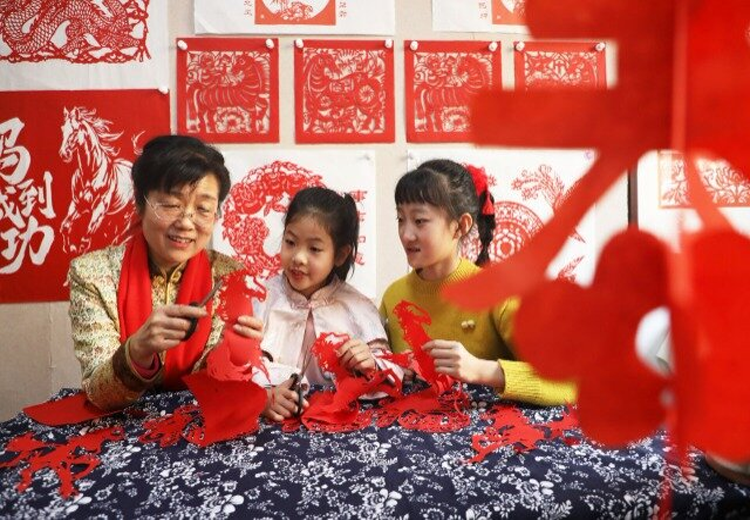 ③近日,在河北省唐山市豐潤區(qū)太平路街道冀新社區(qū),剪紙藝人在教小朋友創(chuàng)作生肖馬剪紙作品。朱大勇攝