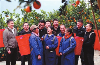 在四川省涼山彝族自治州雷波縣千萬貫鄉(xiāng)青杠村臍橙園里,四川省教育廳定點幫扶雷波工作隊隊長、掛職干部何飛(后排左三)帶領(lǐng)隊員們與果農(nóng)一起拉家常、話豐收。