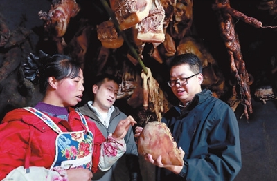 四川省教育廳駐村幫扶干部陳磊(右)、趙睿祥(中)走進雷波縣永盛鎮(zhèn)歐家山村農(nóng)戶家中,探討特色臘肉產(chǎn)品的加工與銷售。