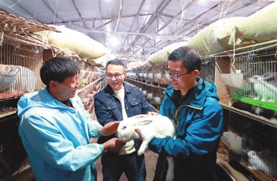 在雷波縣黃瑯鎮(zhèn)中田村肉兔養(yǎng)殖棚里,四川省教育廳駐村幫扶干部蒲元(右)詢問養(yǎng)殖戶生產(chǎn)情況,為該村養(yǎng)殖業(yè)發(fā)展出謀劃策。