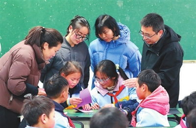 在雷波縣永盛鎮(zhèn)中心校,四川省教育廳駐村幫扶干部、四川省教育科學(xué)研究院教研員朱雪林(右一)發(fā)揮專業(yè)所長,指導(dǎo)基層教師創(chuàng)新課堂教學(xué)方式。