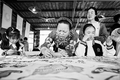 杭州市濱江實驗小學(xué)學(xué)生與貴州省丹寨縣羊甲小學(xué)學(xué)生共繪蠟染長卷。劉靜 攝