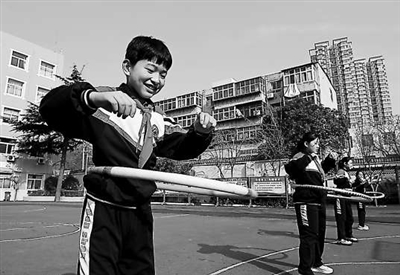 河北省邯鄲市邯山區(qū)邯山小學(xué)的學(xué)生在操場(chǎng)上玩轉(zhuǎn)呼啦圈。 周紹宗 攝