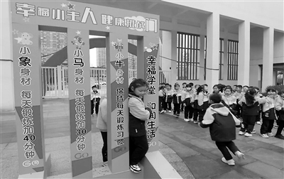 變革的第一步,就從健康的“形象化”表達(dá)開始。學(xué)校在校門口搭建了一座“挑戰(zhàn)健康門”。按照學(xué)生穿過的最小寬度,根據(jù)不同的數(shù)值分為正常、超重、肥胖、超胖四級。四項(xiàng)挑戰(zhàn)分別冠以小動(dòng)物的名字,既區(qū)分身材大小,又保護(hù)了孩子的自尊心。
